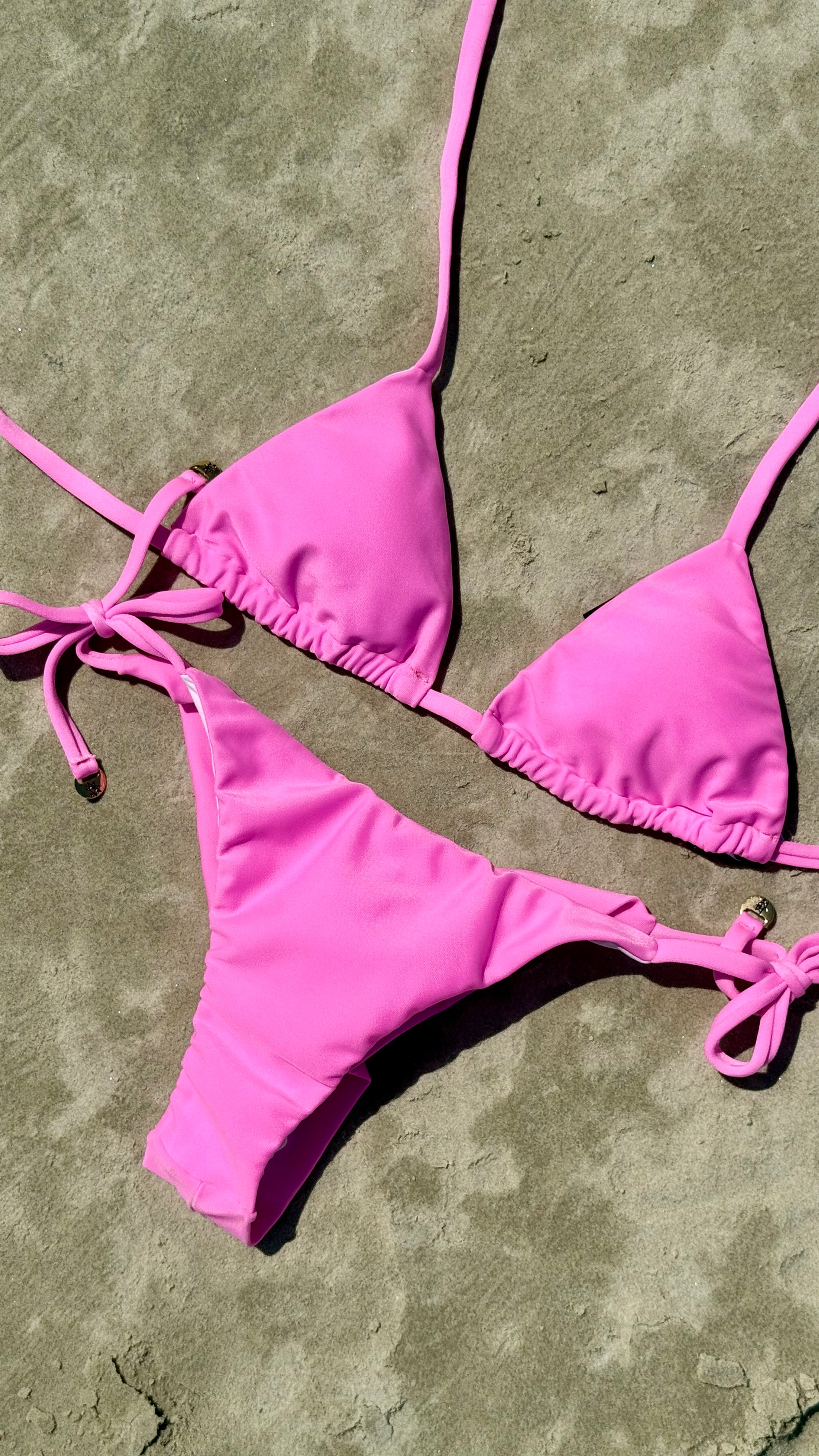 Versátil e cheio de estilo, o Biquíni é perfeito para quem busca praticidade e liberdade de movimento. A parte de cima modelo cortininha tradicional móvel possui bojo removível, valorizando o busto de forma natural. A calcinha fio duplo com amarração fina nas laterais adiciona delicadeza e sensualidade ao visual. Confeccionado em tecido liso, o conjunto garante um toque clássico e sofisticado, ideal para qualquer ocasião à beira da água.
