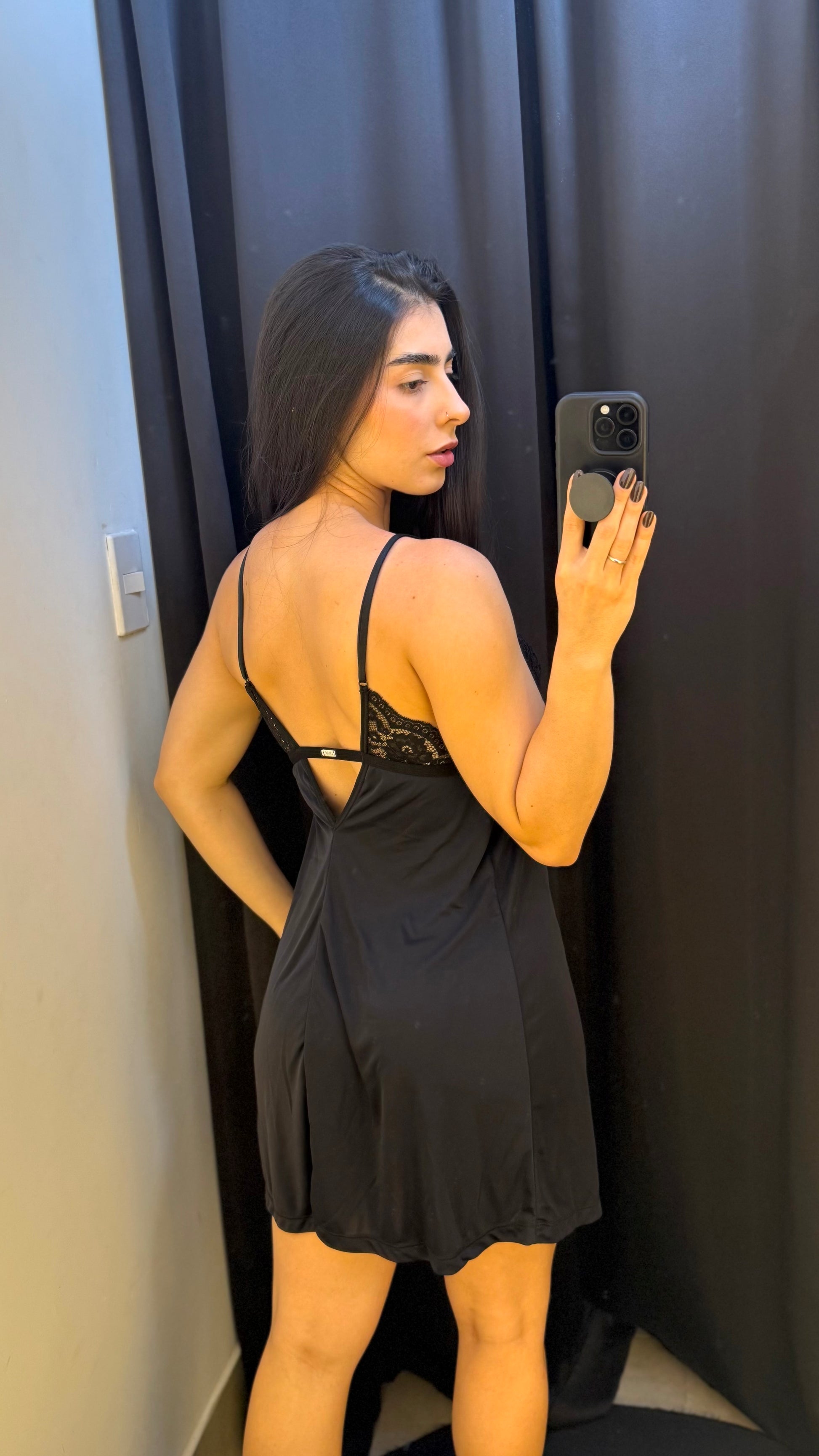 Camisola de liganete com bojo removível e busto rendado. Alças finas reguláveis, pequeno decote no busto e detalhe nas costas.
